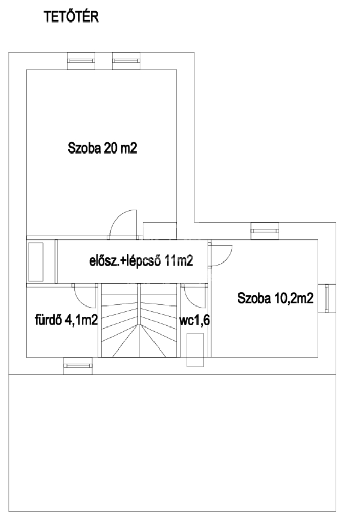 Emelet: 2 hálószoba (20 és 10,2 m²) split klímákkal, sarokkádas fürdő (4,1 m²), külön WC (1,6 m²), tároló