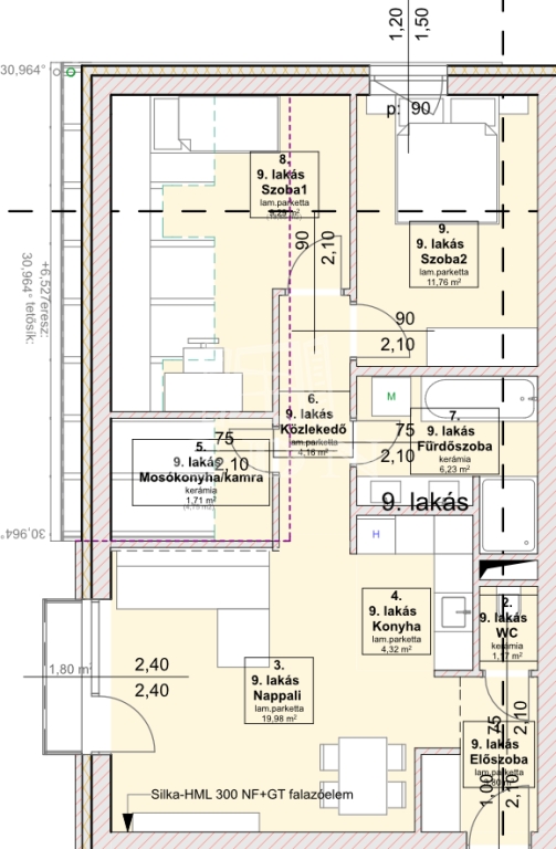 A B9 megjelölésű második emeleti lakás 62,7 m2 alapterületű. Az amerikai konyhás nappalin túl 2 szoba, háztartási helyiség/kamra, fürdőszoba, mellékhelyiség, és előszoba kapott teret a lakásban. A közösségi térből közelíthető meg a 2 m2-es erkély.