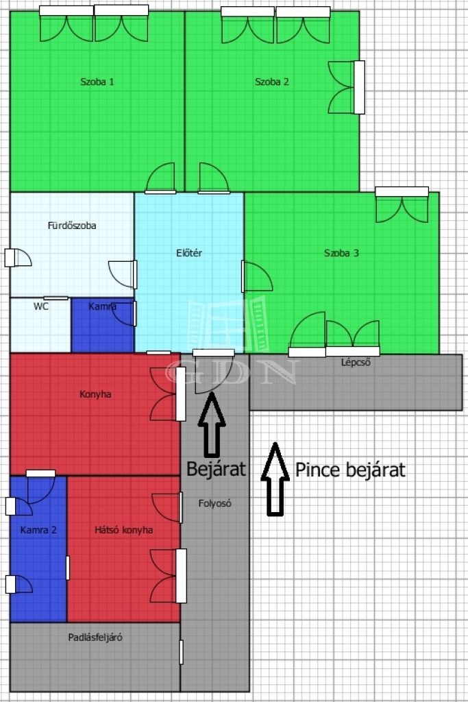 Helyiségek: 3 tágas szoba, 2 konyha, 2 kamra – praktikus elrendezéssel