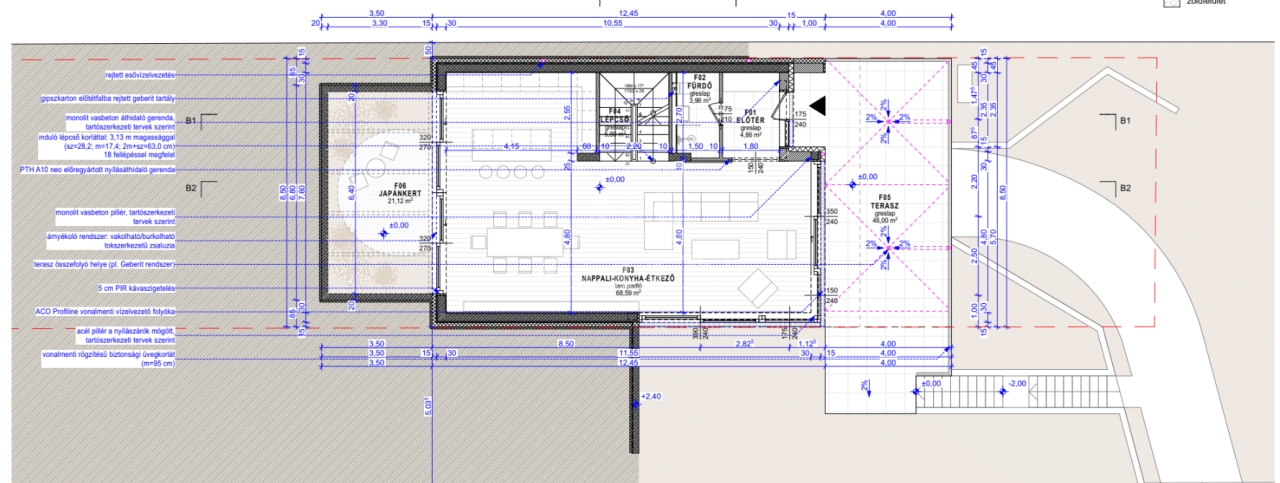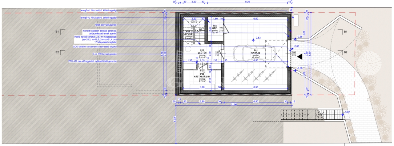 Szerkezet: YTONG falazat 15 cm szigeteléssel, PIR hőszigetelt lapos tető.