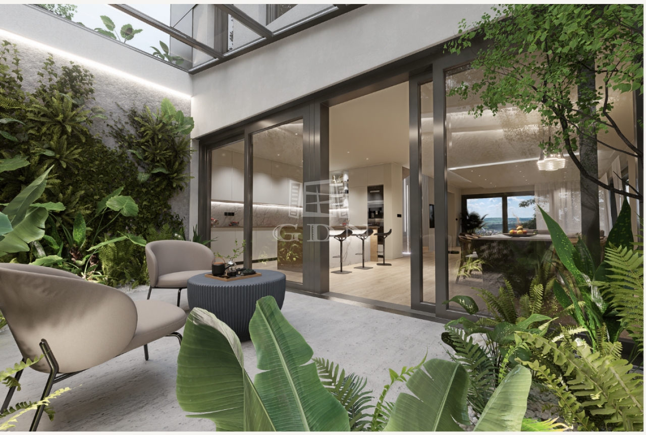 Wellness & Relax: 46 m²-es panorámás terasz és egy egyedülálló, 21 m²-es belső japánkert, amely a ház szívét alkotja.
