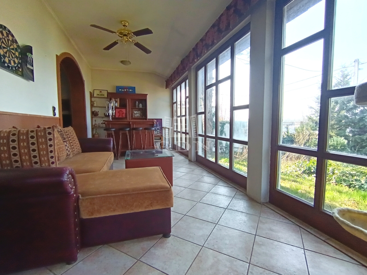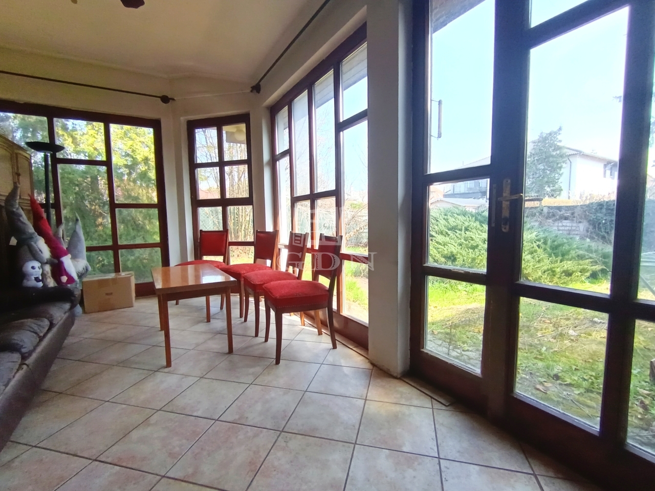 A veranda üvegfelületén át a csodás zöld udvarra látunk ki.