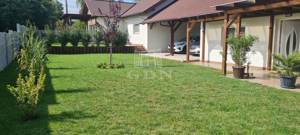 Eladó egy újszerű állapotban lévő, 138 m²-es családi ház, amely jogilag családi ház, de kialakításában inkább egy ikerház jellegű ingatlan – az épületek csak a fedett kocsibeállónál érnek össze.