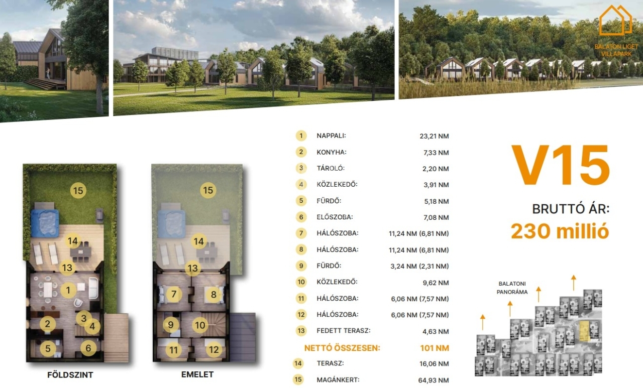 Levegős hőszivattyú (VRV splitklíma), 2,5 kW napelem rendszer, elektromos redőny, szúnyogháló, beépített bútorok, homlokzati díszvilágítás.