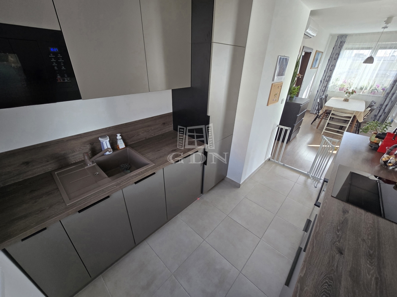 A 92 m²-es, kiváló elosztású alapterület (étkezős nappali + 3 szoba, külön konyha, 2 fürdőszoba).