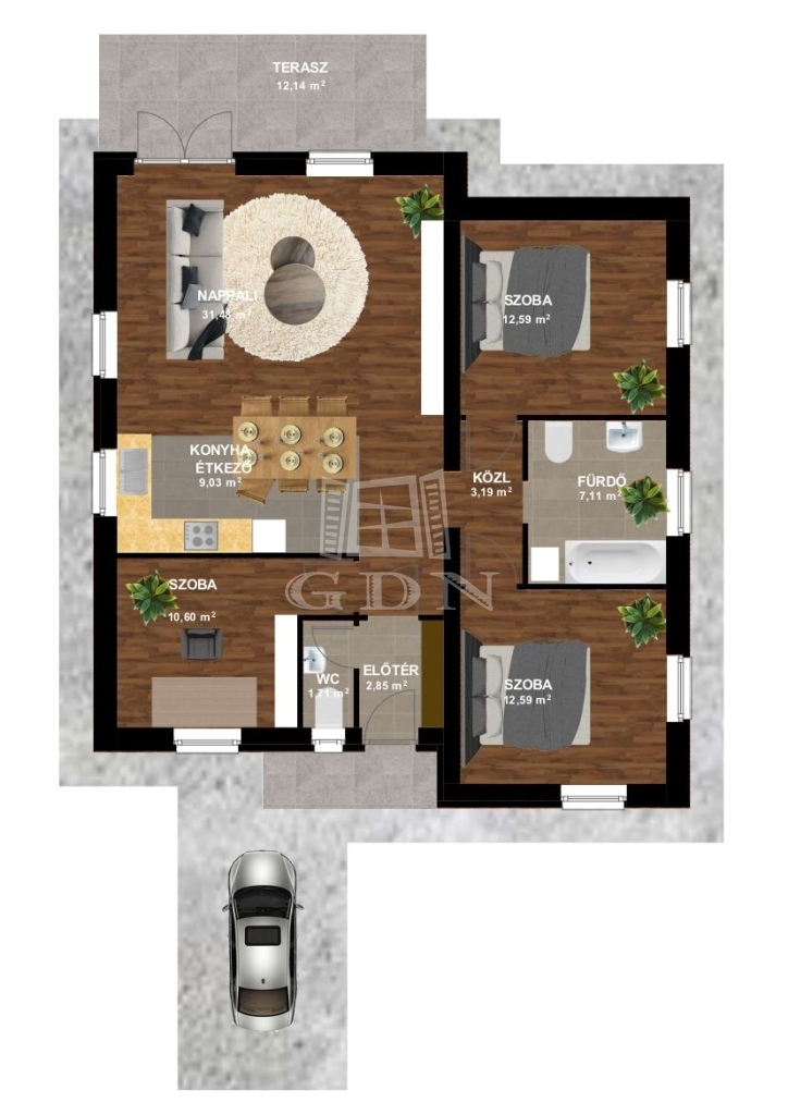 A ház 91 nm-es, nappali+amerikai konyha található benne, három hálószoba, és egy fürdőszoba.