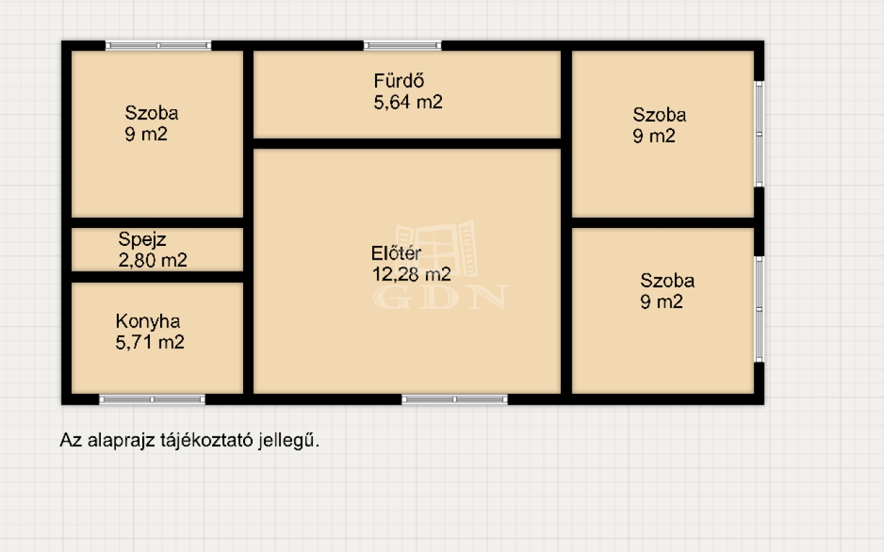 - 53 m2-en ad helyet egy előtérnek, 3 szobának, egy konyhának, egy fürdőkáddal és toalett felszerelt fürdőnek, valamint egy spejznek.