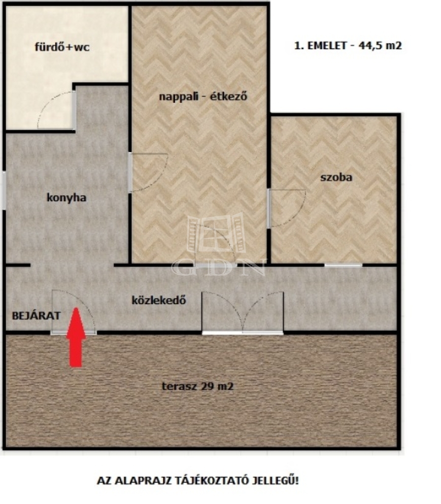 1. EMELET: 44,5 m2 – 2 szoba – 1 fürdő – TERASZ: 29,3 m2