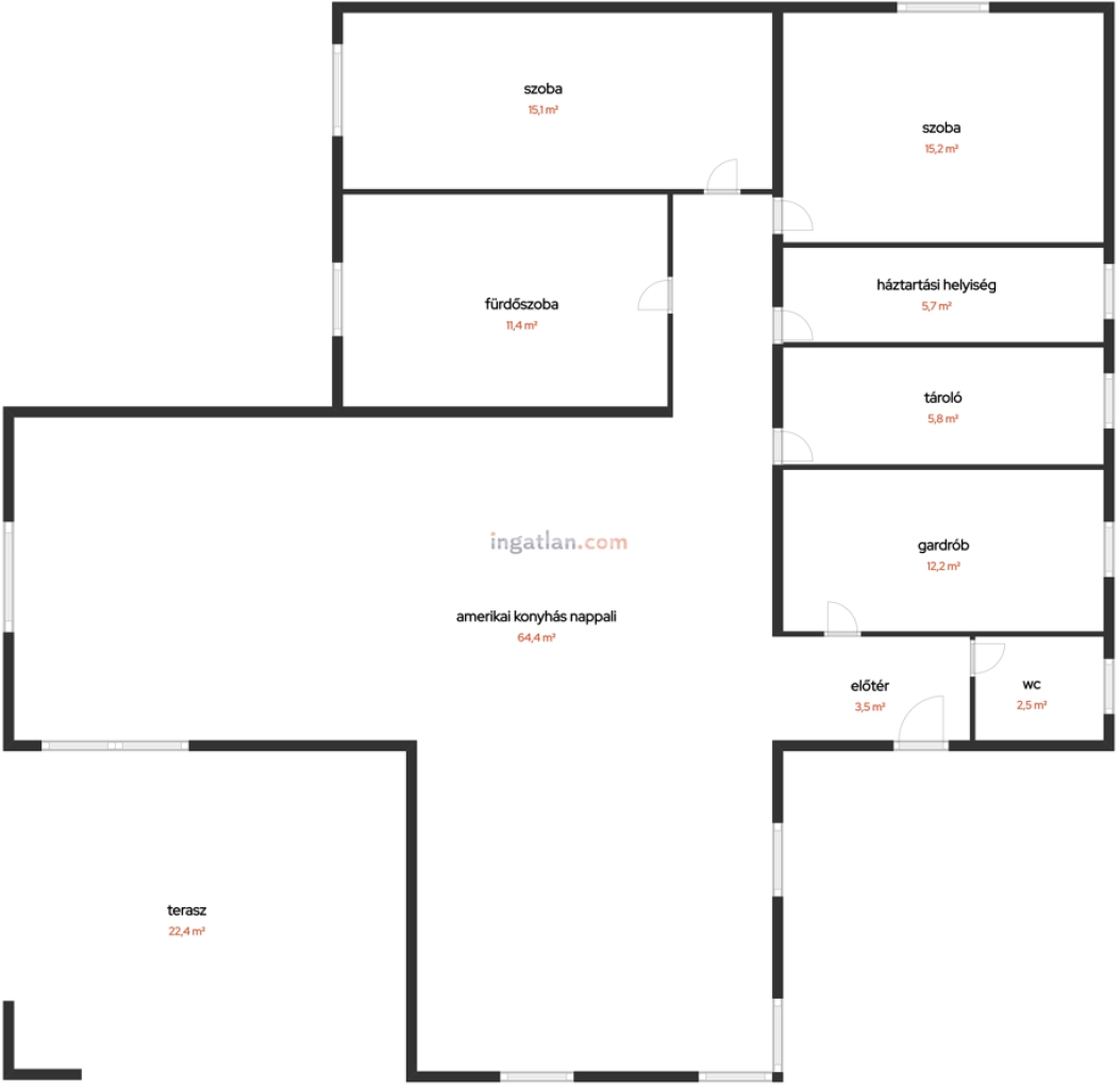 Egy hatalmas amerikai konyhás nappali, 3 hálószoba, 1 tágas gardrób szoba, és 1 dolgozó szoba is helyet kapott az ingatlanban. Ezen felül 2 fürdőszoba+wc és 1 különálló vendég wc, mosókonyha és gépház is megtalálható.