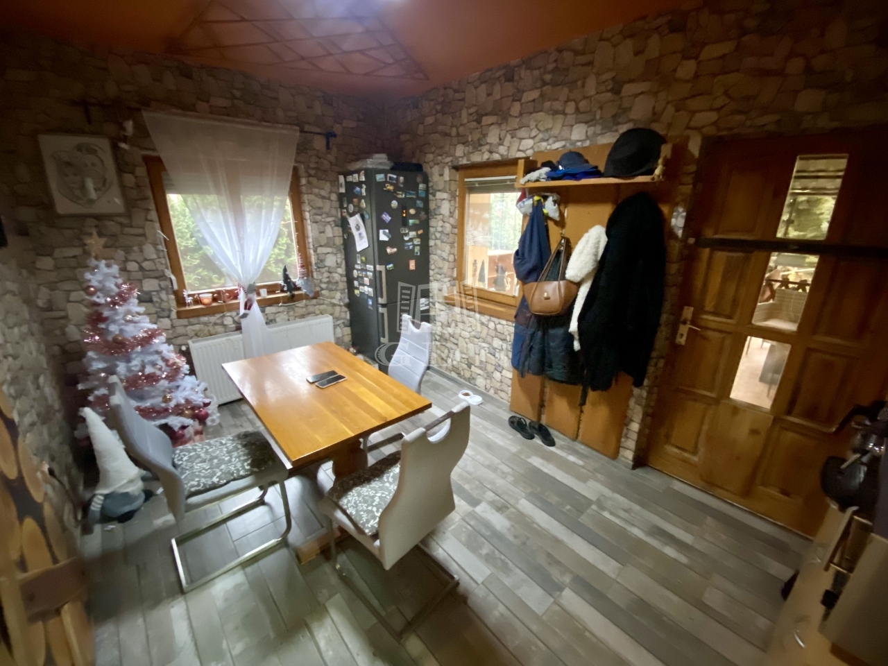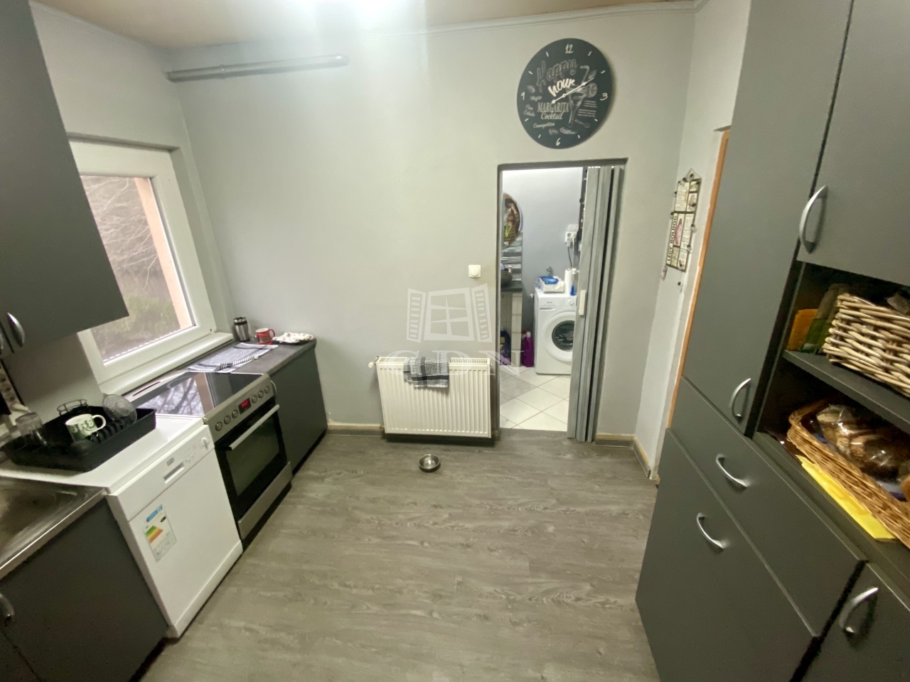 A teraszról az előszobába lépve került kialakításra az étkező, ahonnan nyílik egy szoba, illetve a konyha, melyben iparossal, egyedileg méretre készített konyhabútor található. A konyhából nyílik a fürdőszoba illetve még egy szoba. A fűtést gáz cirkó rendszer biztosítja.