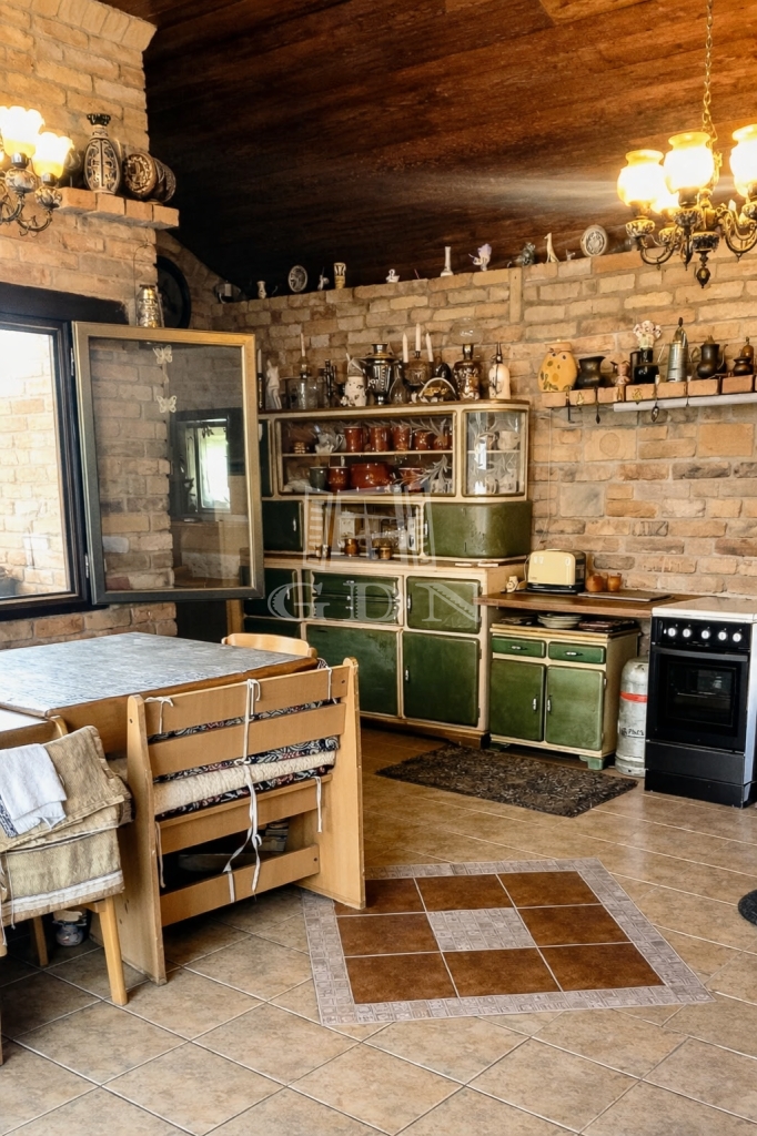 A házhoz kapcsolódik egy hangulatos, rusztikus stílusú, fedett terasz, amely egyedi elképzelések alapján, gondos kivitelezéssel készült.