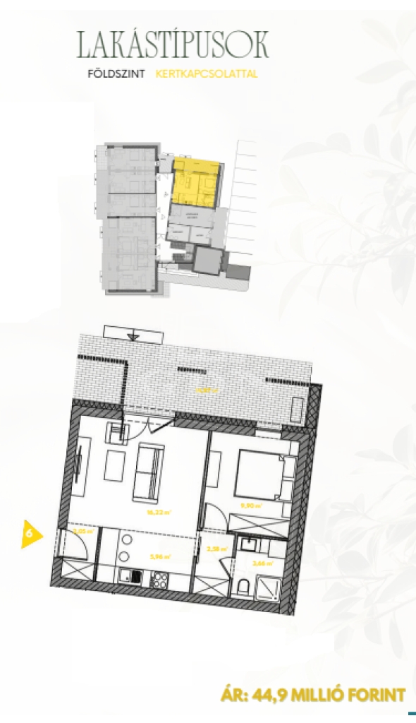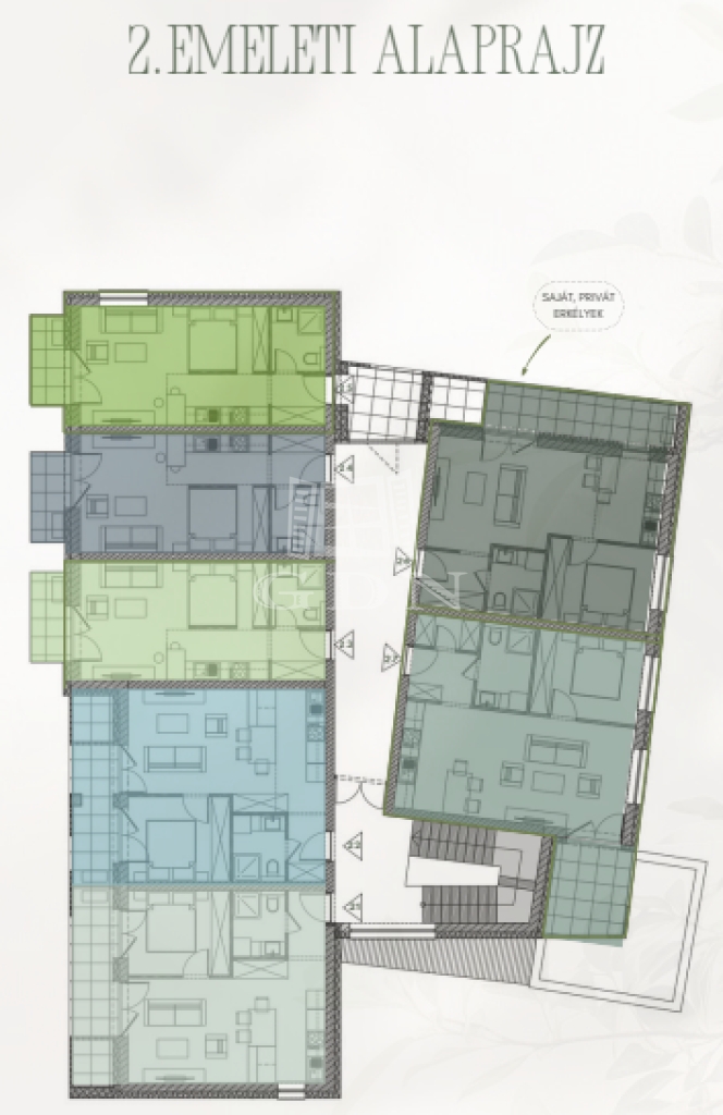 A 3 szintes lakóépület földszintjén, illetve első és második emeletén további lakások helyezkednek el, melyek 29, 30, 39, 40 és 46 m2 alapterületűek.