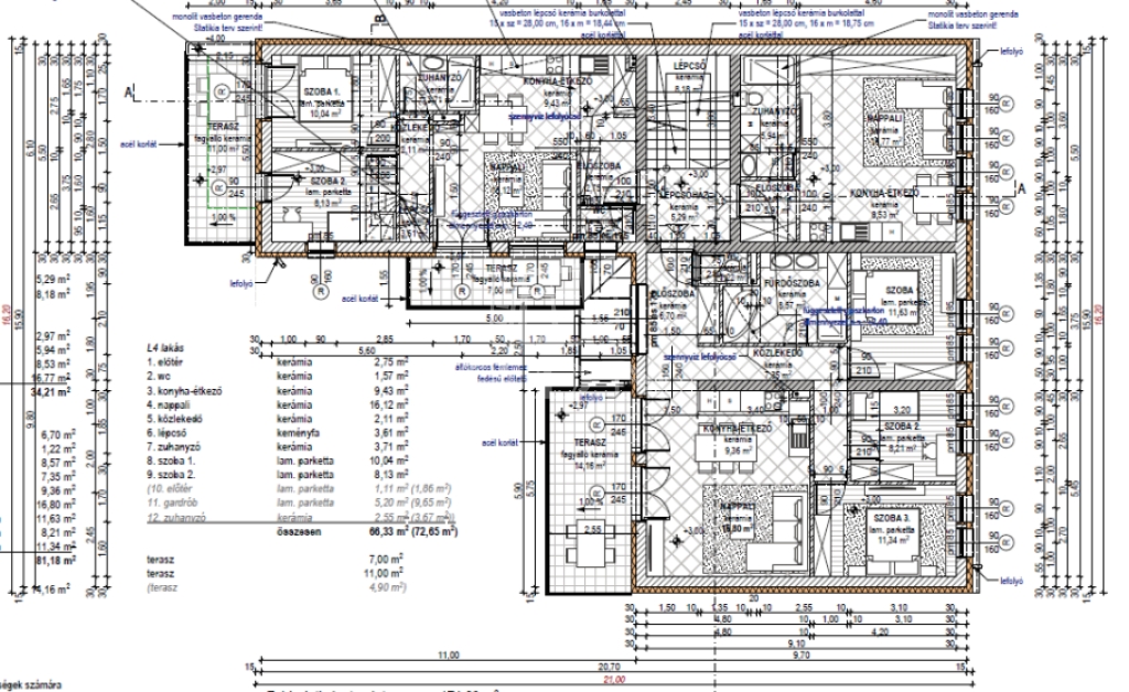 Szombathely belvárosában, a " költők utcái " városrészen csendes, átmenő forgalomtól mentes utcában hat lakásos társasházban, prémium kategóriás lakások, közös kertkapcsolattal eladók. Az ingatlanban mindenki számára alkalmas lakások épülnek. Egy szobástól - négy szobásig, 34 m2 - 86 m2 között. Különlegessége, hogy az első emeleti egyik lakása belső kétszintes. Az ingatlan magas műszaki tartalommal készül. A lakásokat elválasztó falazat hanggátló téglából épül. Homlokzatára 15 cm vastag EPS szigetelés kerül, dryvit vakolattal. Műanyag, fokozottan hang-és hőszigetelt nyílászárói kívül barna, belül fehér színű tokszerkezettel 3 rétegű üvegezéssel készül, redőnyökkel felszerelve. A tetőtérben Fakro ablakokra tervezett, hővédő árnyékolókkal. A fűtés, meleg vízellátás a mai kor követelményeinek leginkább megfelelő házközponti LG hőszivattyús fűtésrendszer kerül kialakításra, H tarifával, minden helyiségben padlófűtéses hőleadással. Napi és heti programozású digitális termosztátokkal. A fürdőszobákban a padlófűtés mellett, törölköző szárítós radiátorok lesznek kialakítva. A lakások nappalijában hűtő-fűtő klíma kerül. Villanyhálózata 3 x 16 Amper teljesítményű. Választható hideg-meleg burkolatok, szaniterek, csaptelepek, beltéri ajtók. Zárt, parkosított udvarában felszíni parkolók, fedett gépkocsibeállók vásárolhatók. Az ingatlan klasszikus, igényes külső megjelenése belvároshoz méltó. A hirdetésben szereplő lakás L3-as, 81.18 m2, +14.16 m2 terasz. Első emeleti, 4 szobás lakás, kertre néző terasszal.