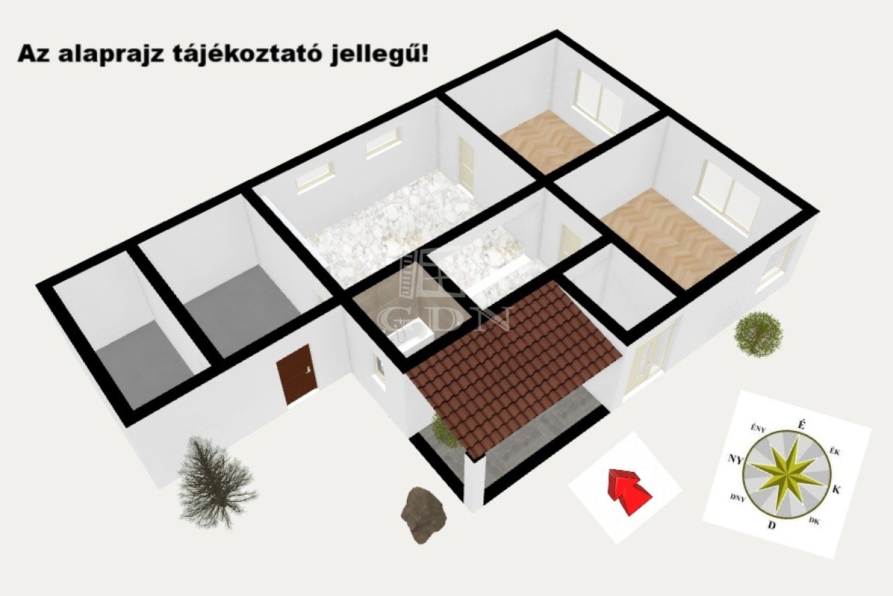 Belső elrendezés: három szoba, melyek közül kettő egymásból és külön-külön is nyílik. Kialakításra került egy AMERIKAI KONYHÁS nappali élettér. A fürdőszoba ABLAKOS, a toalettel egy légtérben. Az ingatlan BEFEJEZÉSRE VÁR, így TESTRE SZABHATÓ befejezést és belső kialakítást tesz lehetővé.