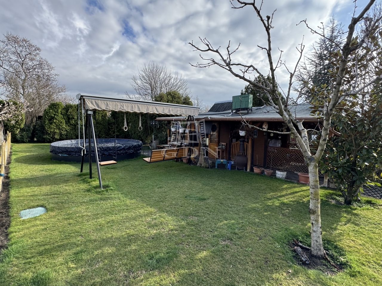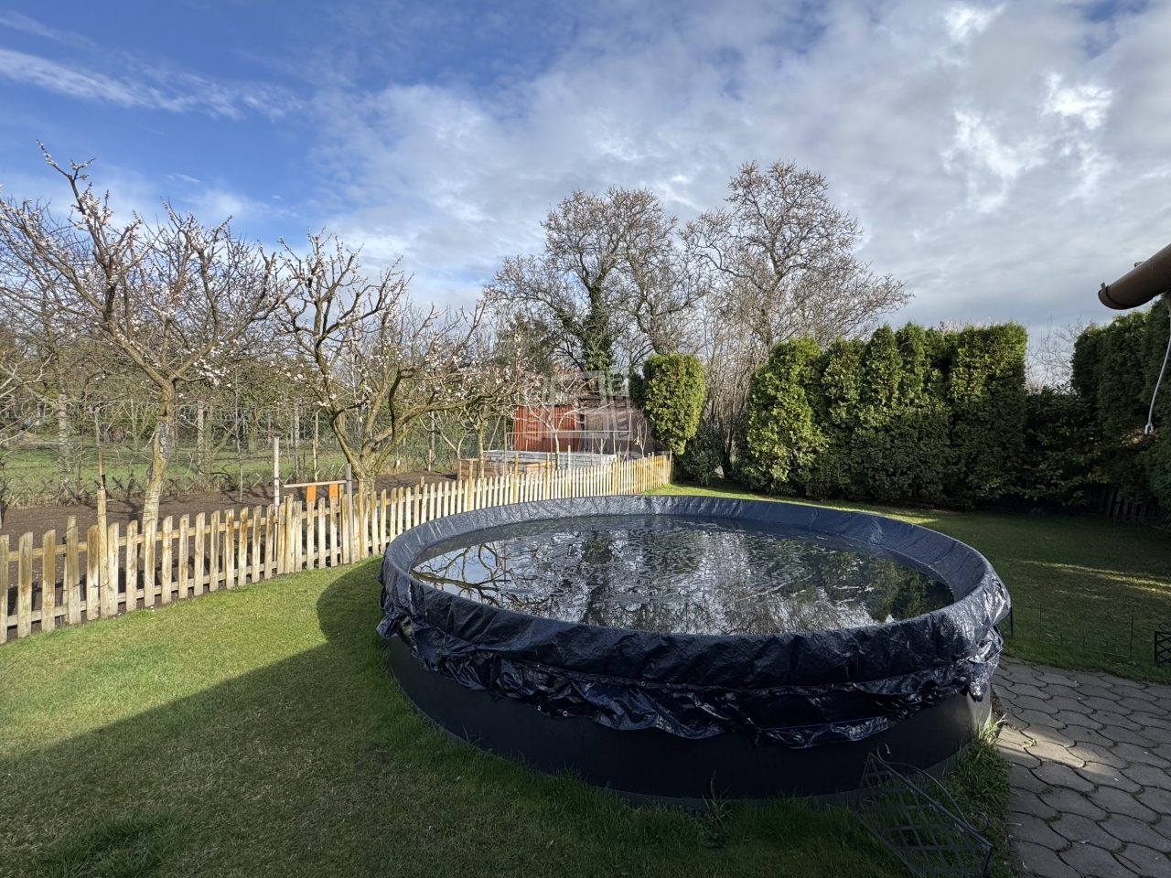 A telken kiépítettek továbbá egy nagyon hangulatos, kb. 30 m² nyári konyhát, sütögetővel együtt, valamint mellette egy fűthető medence is van.
