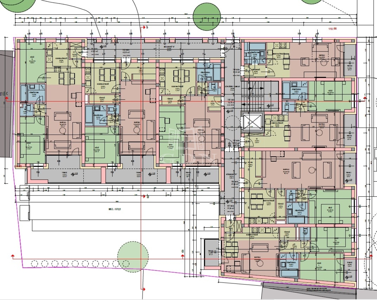 Az alagsorban 16 db a földszinten pedig 12 db fedett kocsi beállót alakítunk ki, melyek külön megvásárolhatók. Az épület földszintjén 1 db iroda és egy tágas fogadó tér lesz, amiből a lépcsőház és lift közelíthető meg. Az I-II-III emelet 7 db és a záró szinten 6 db lakás helyezkedik el, méretüket tekintve : 14 db lakásunk készül ami 60 m2 fölötti, 2 db ami 50-60 m2 közötti.