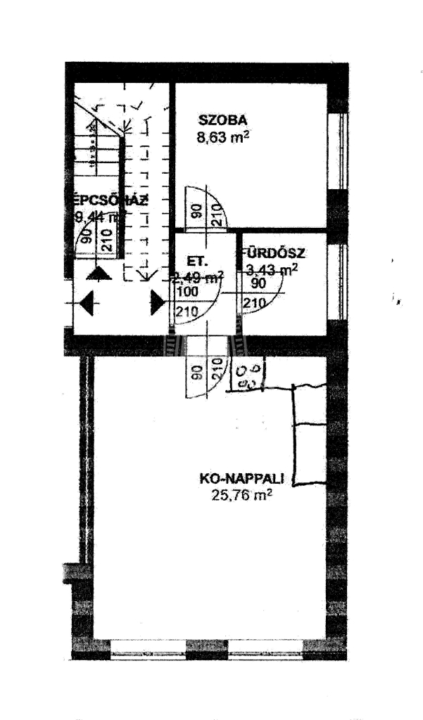 1. emeleten 25,6 m2 (konyha nappali) ,8,63 m2 hálószoba