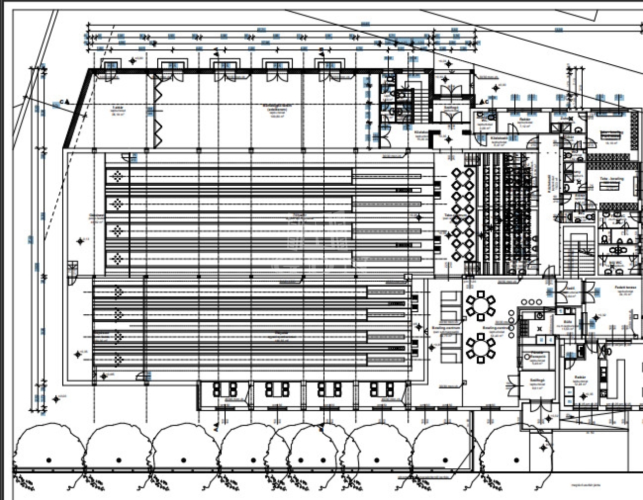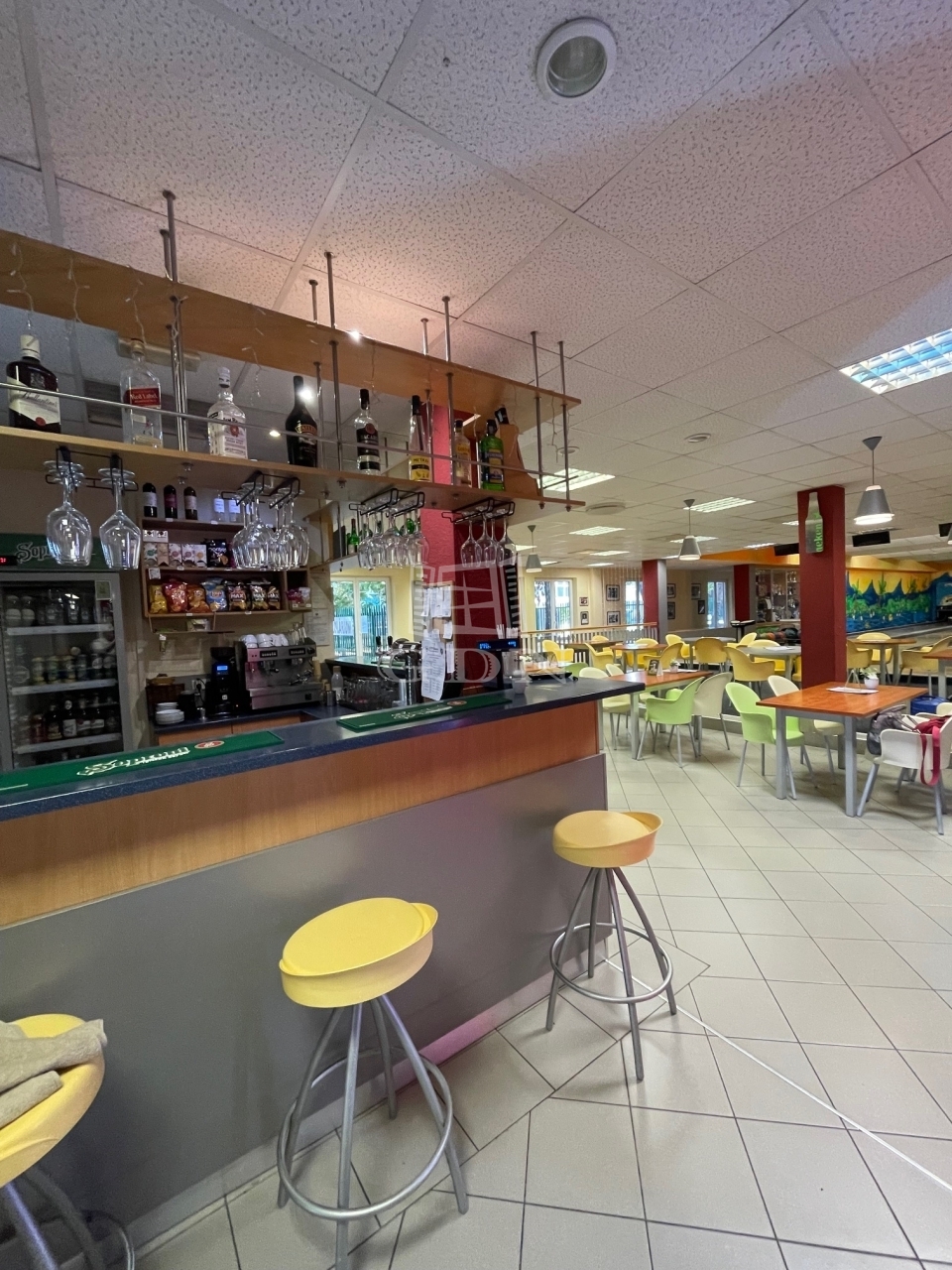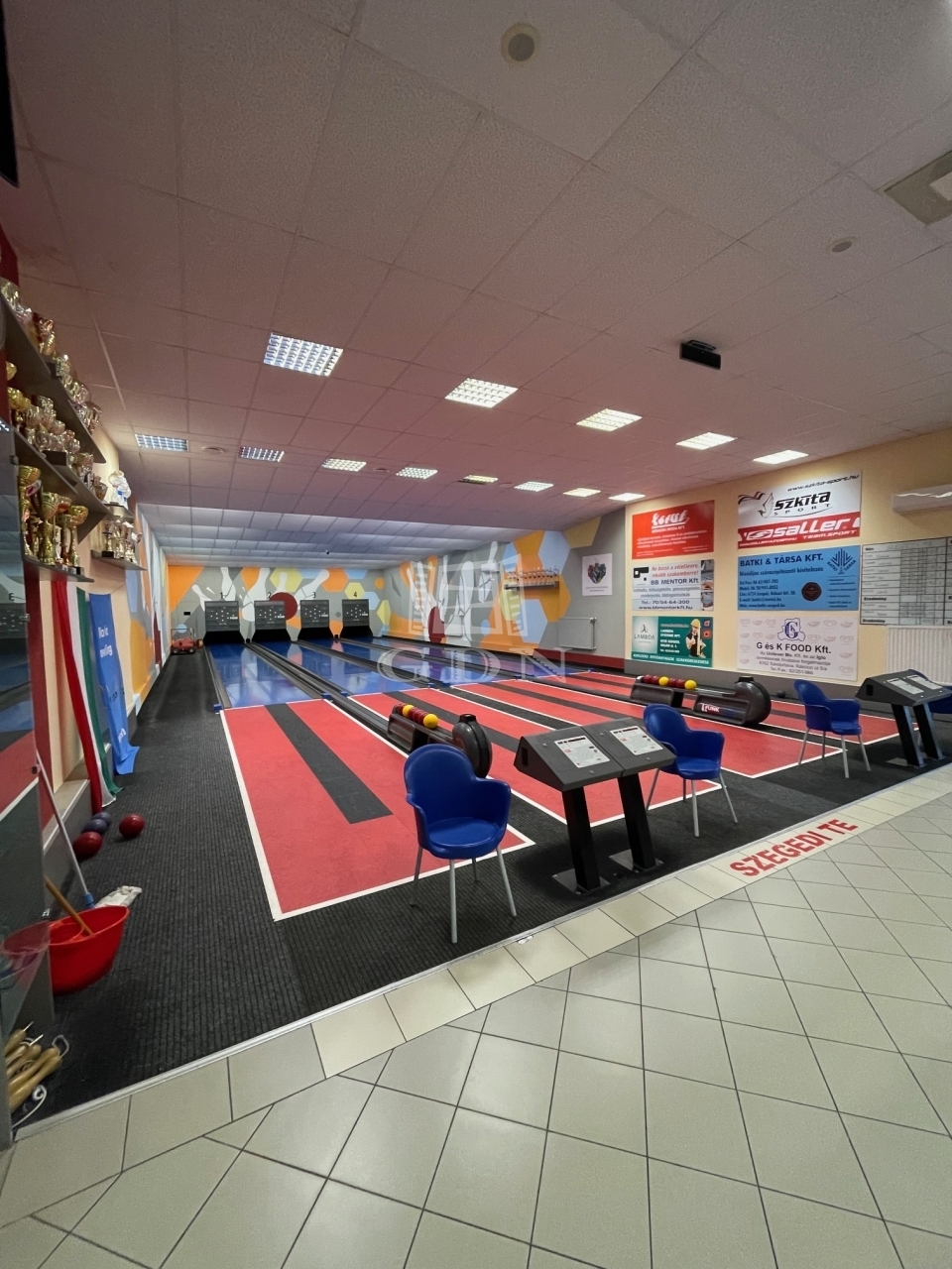 A földszinti részen találhatóak a bowling illetve teke pályák, büfé és kerthelyiség.