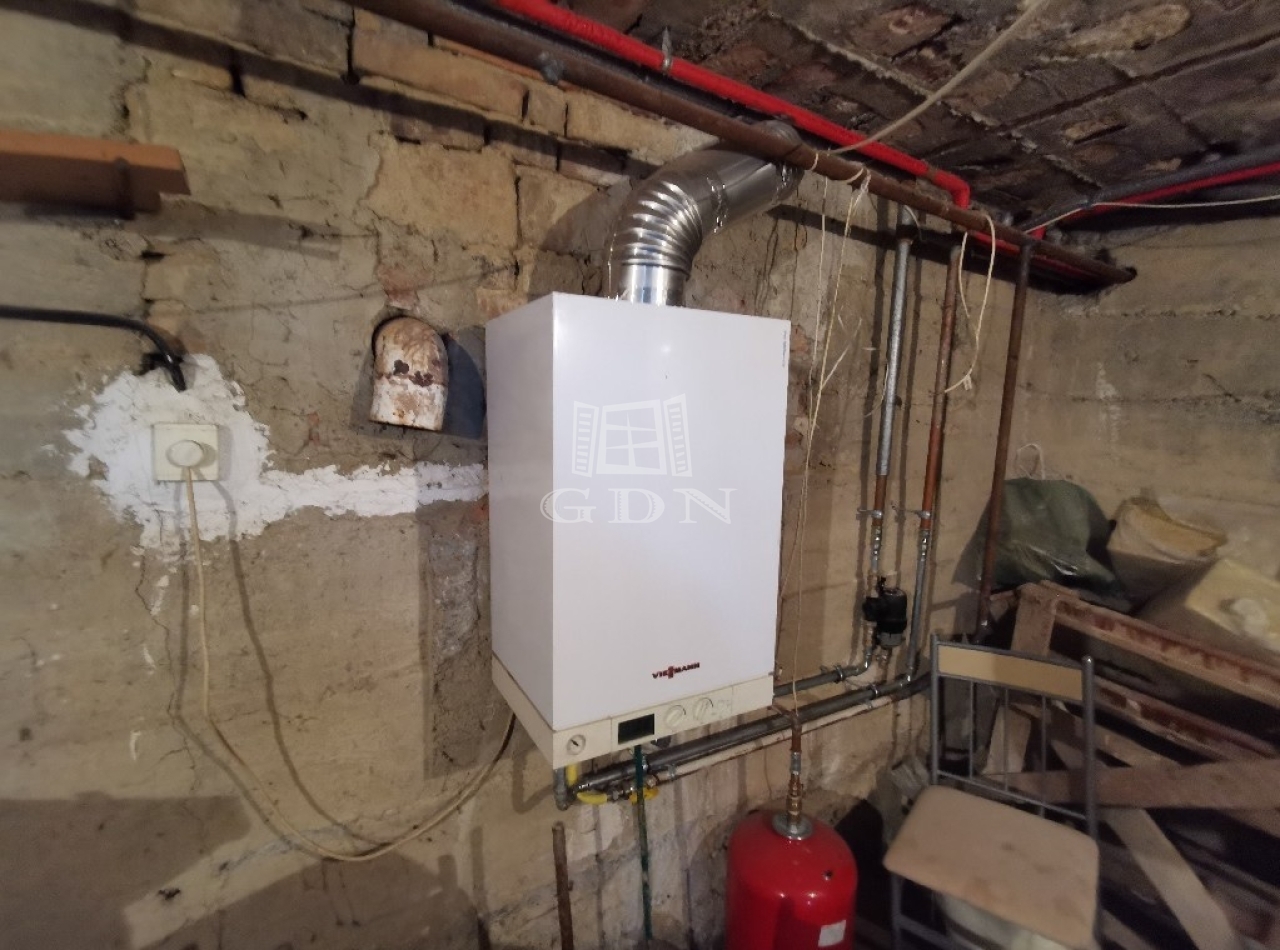 A ház teljesen alá van pincézve, zöldséges pince, tároló, fatároló és egy kb. 20 nm-es leválasztott helyiségben kapott helyet a gázkazán, ami jelenleg a ház fűtését biztosítja radiátoros hőleadással. A melegvíz ellátás villanybojlerrel történik.