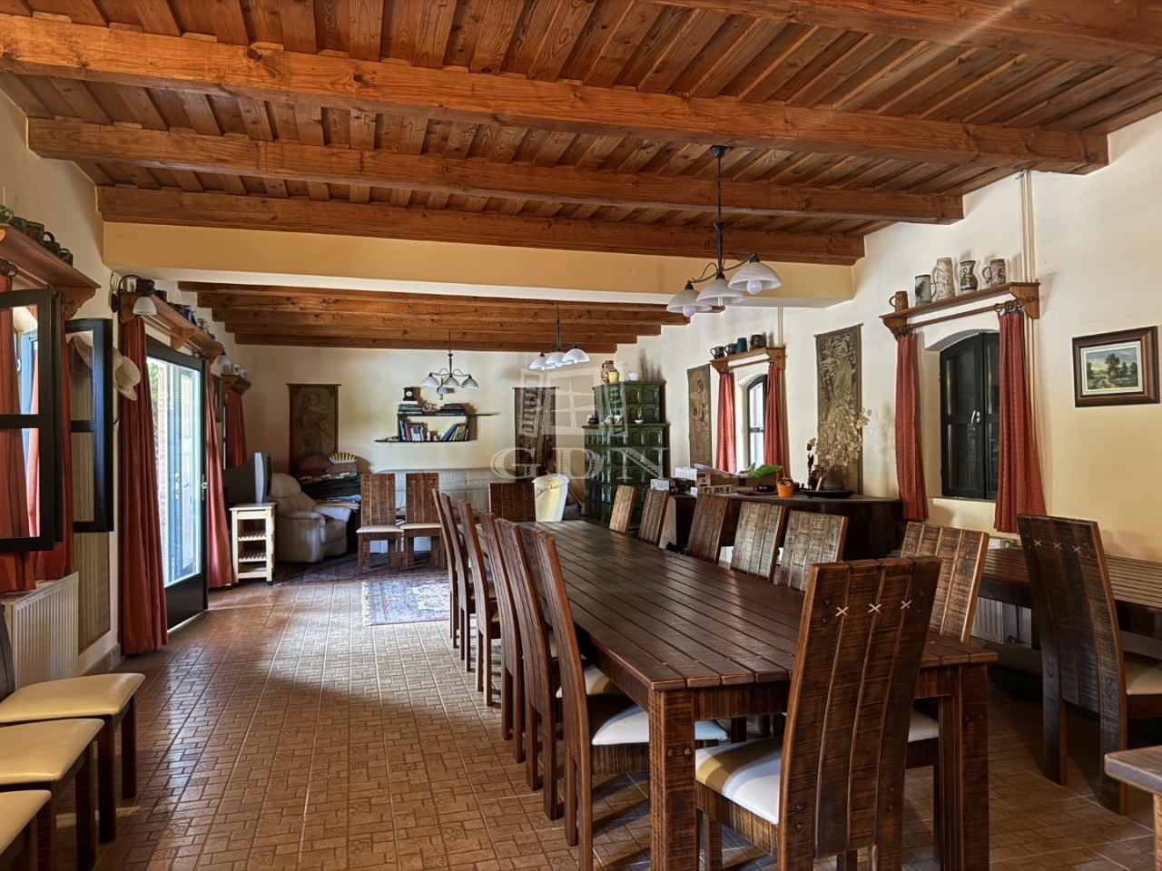 Az U alakú épületben ,több állásos gépkocsitároló, egy látszógerendás kb 50m2-es közösségi tér, és tárolók vannak.
