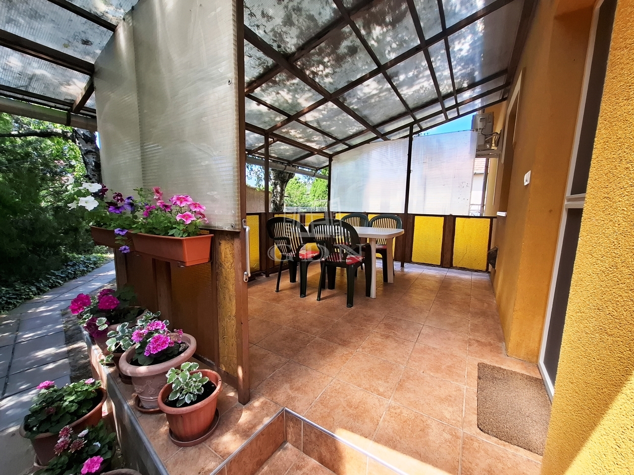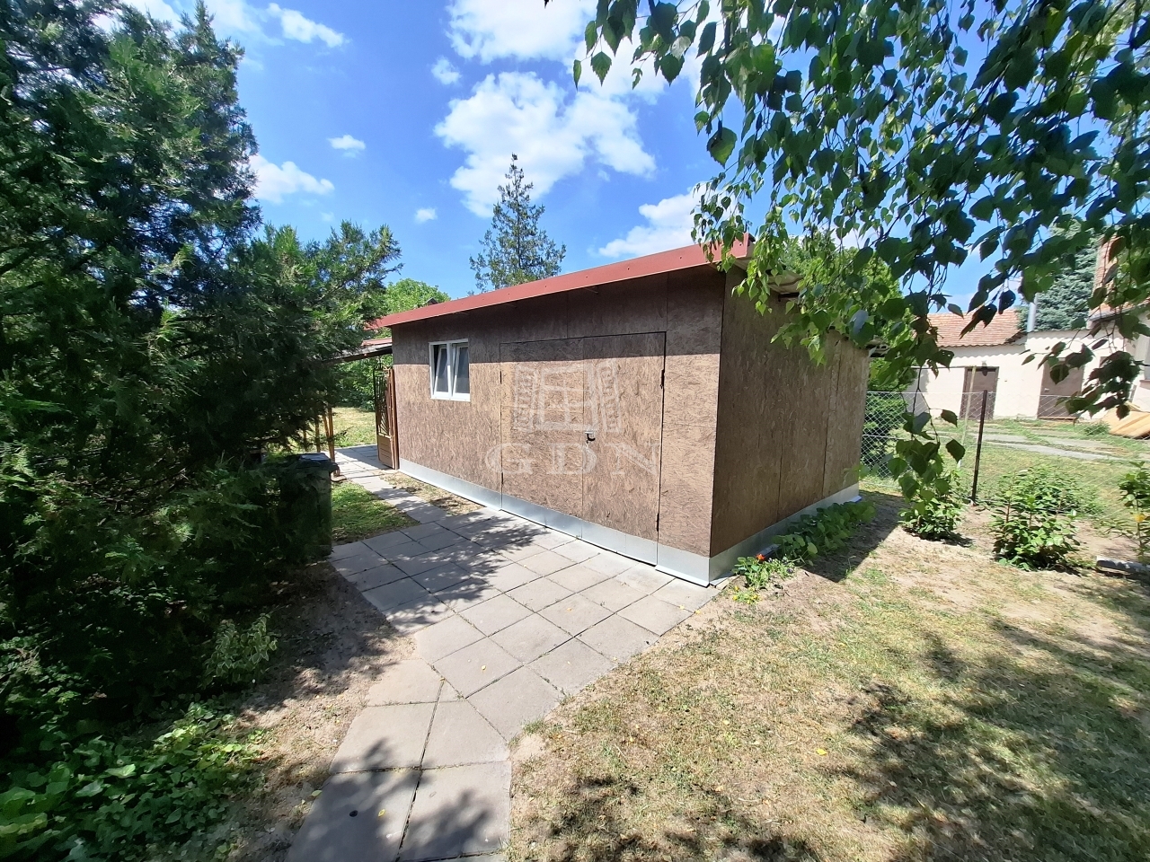 A kert rendezett fákkal, dísznövényekkel beültetett, két utcáról megközelíthető, két autó parkolását kényelmesen biztosítja, valamint rendelkezésre áll két kerti tároló.