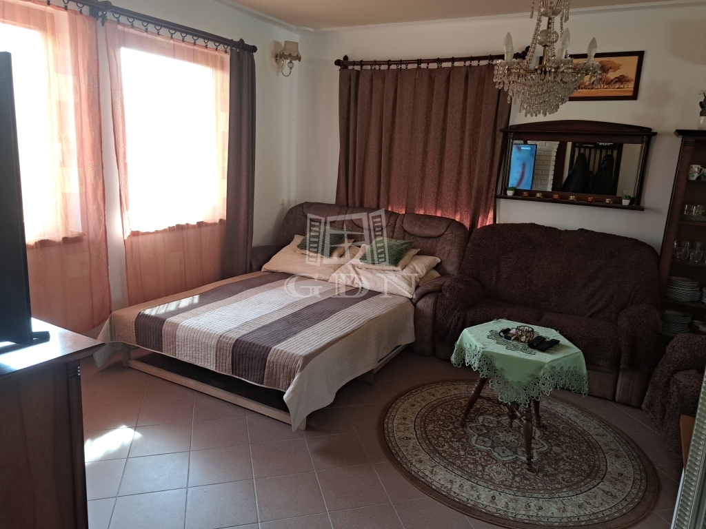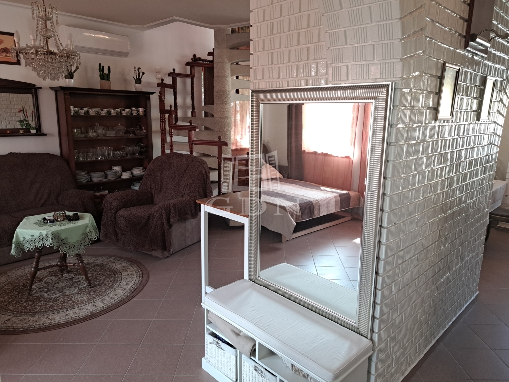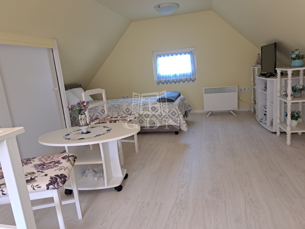 A vendégház 45 nm alapterületű alsó szinten szoba, előszoba, teakonyha, fürdőszoba, elosztású. az emeleten egy tágas galériás szoba.