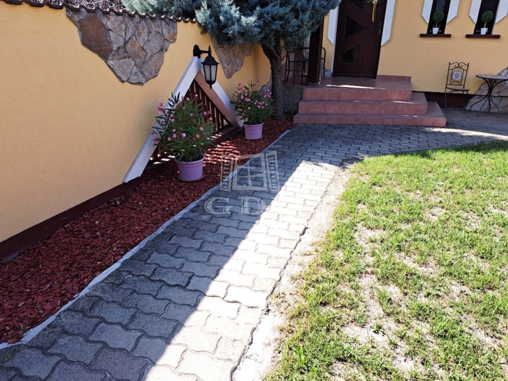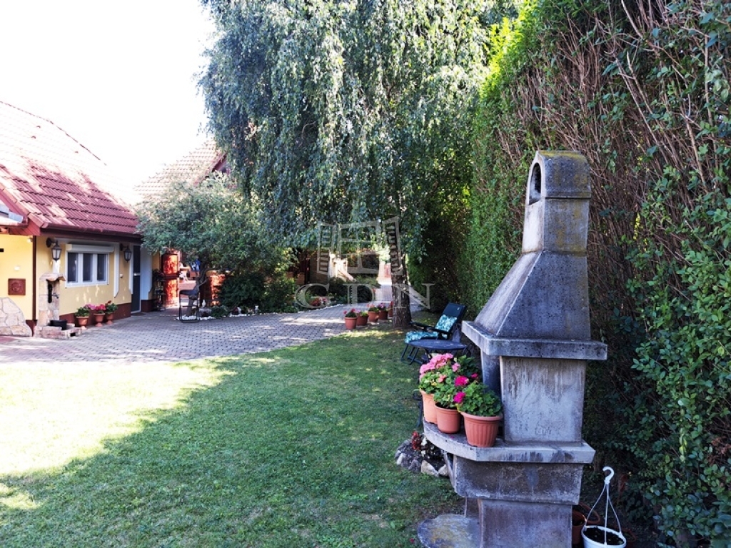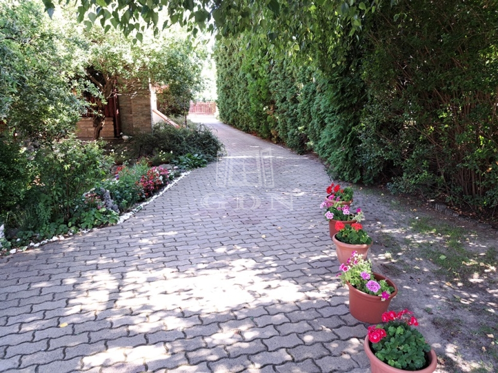 A kert rendezett parkosított dísznövényekkel, tujákkal, sövényekkel körülvett az öntözés fúrt kútról biztosított.