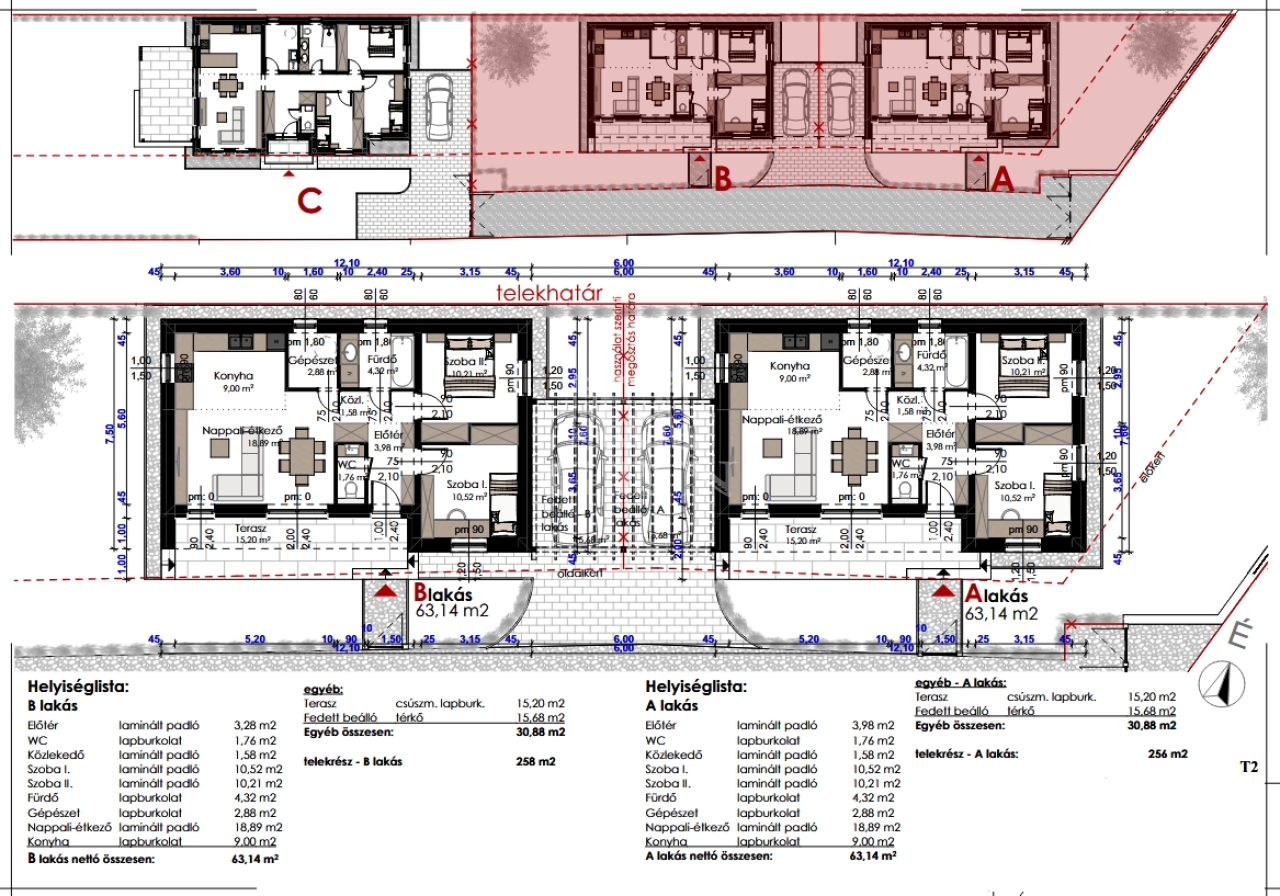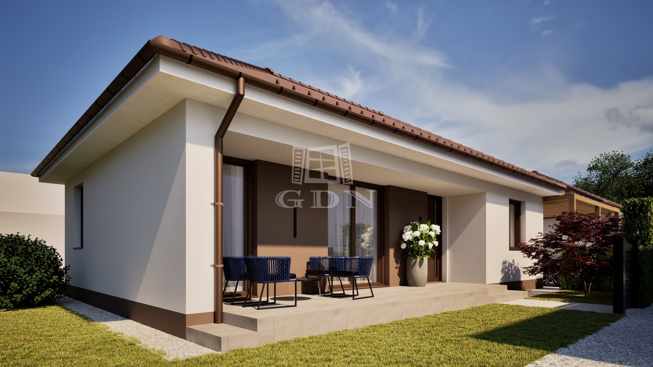 A Wienerberger Porotherm téglából épülő házak magas műszaki tartalommal épülnek. Tetőszerkezete C22 I. osztályú , rovar, gomba és lángmentesítővel kezelt faanyaggal kerül kivitelezésre. Fedése Terran vagy Bramac cseréppel történik, az összes rendszer tartozékkal, előírások szerint helyenként hófogóval. Bádogos szerkezetek, a külső vízelvezetések ereszcsatornái, a lefolyócsövei és az egyéb bádogos szerkezetek 0.6 mm vastag acéllemezből készülnek. Homlokzati falfelületek 15 cm vastag EPS hőszigetelő rendszert, a lábazatok 10 cm vastag XPS lábazati hőszigetelő rendszert kapnak. A padozatokba 10 cm vastag teherbíró EPS hab hőszigetelés kerül. A födém hőszigetelése 25 cm vastag ásványgyapot szigetelőanyaggal történik. Külső nyílászárói műanyag, három rétegű üvegezéssel szerelt, fokozottan hang-és hőszigeteltek. Fűtése, a háztartási helyiségben elhelyezett 10Kw teljesítményű Gree Versati 3 hőszivattyúval történik, padlófűtéses hőleadással szabályozható termosztáttal. A hőszivattyú biztosítja a melegvizet is, egy 200 literes hőtárolós víztartállyal. Nappaliában 3.5 Kw teljesítményű hűtő- fűtő klíma kerül. Az ingatlanban riasztó, kaputelefon előkészítés történik. Beltéri ajtók, hideg-meleg burkolatok, szaniterek, csaptelepek választhatók.. Ha bővebb tájékoztatást szeretne, kérem keressen. Vegye igénybe irodánk szolgáltatásait. Hitelügyintézésben is segítünk.