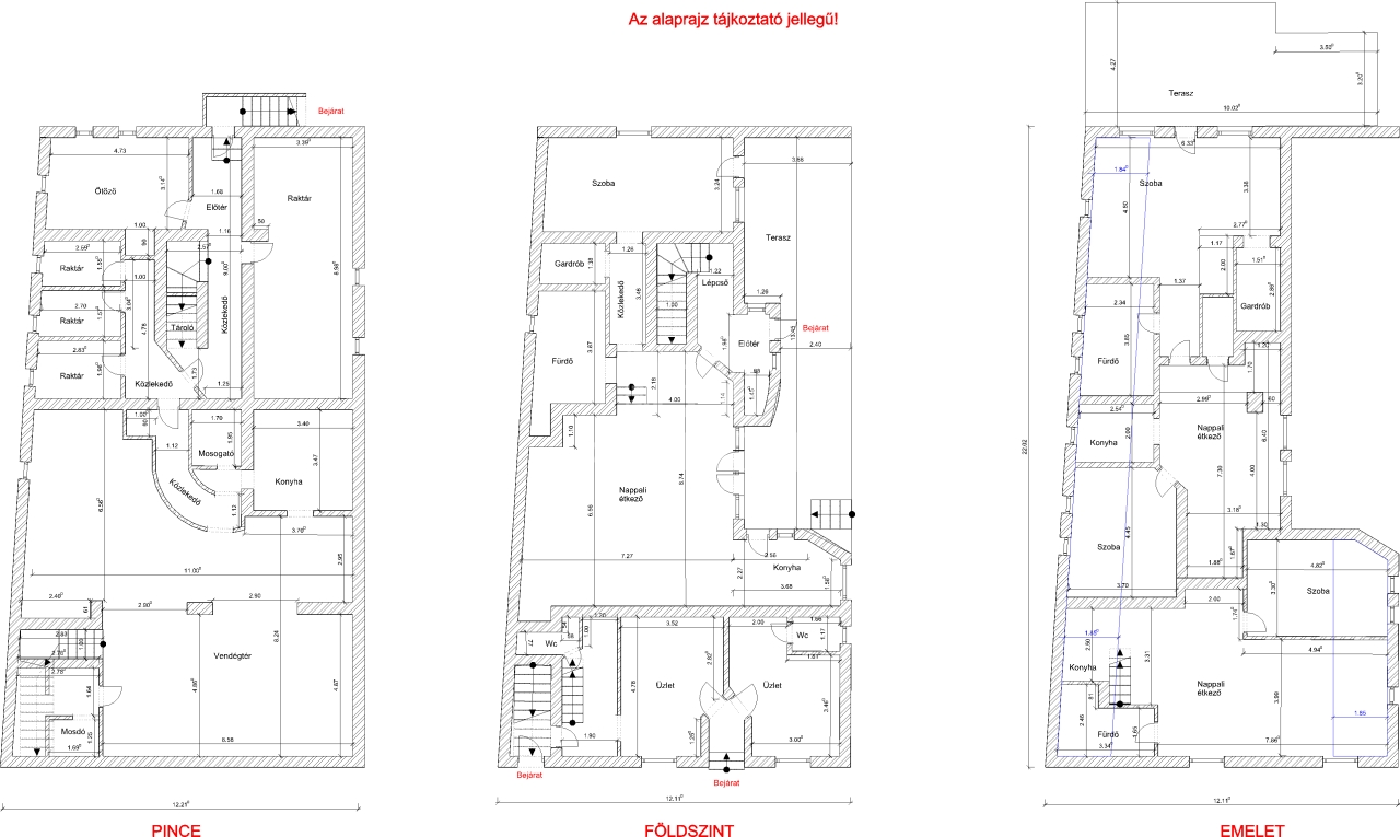 Az egyik üzlethelyiséghez a tetőtérben egy teljes értékű lakás tartozik: lakás: bruttó 61,5 nm2, nettó 40,22 nm2).