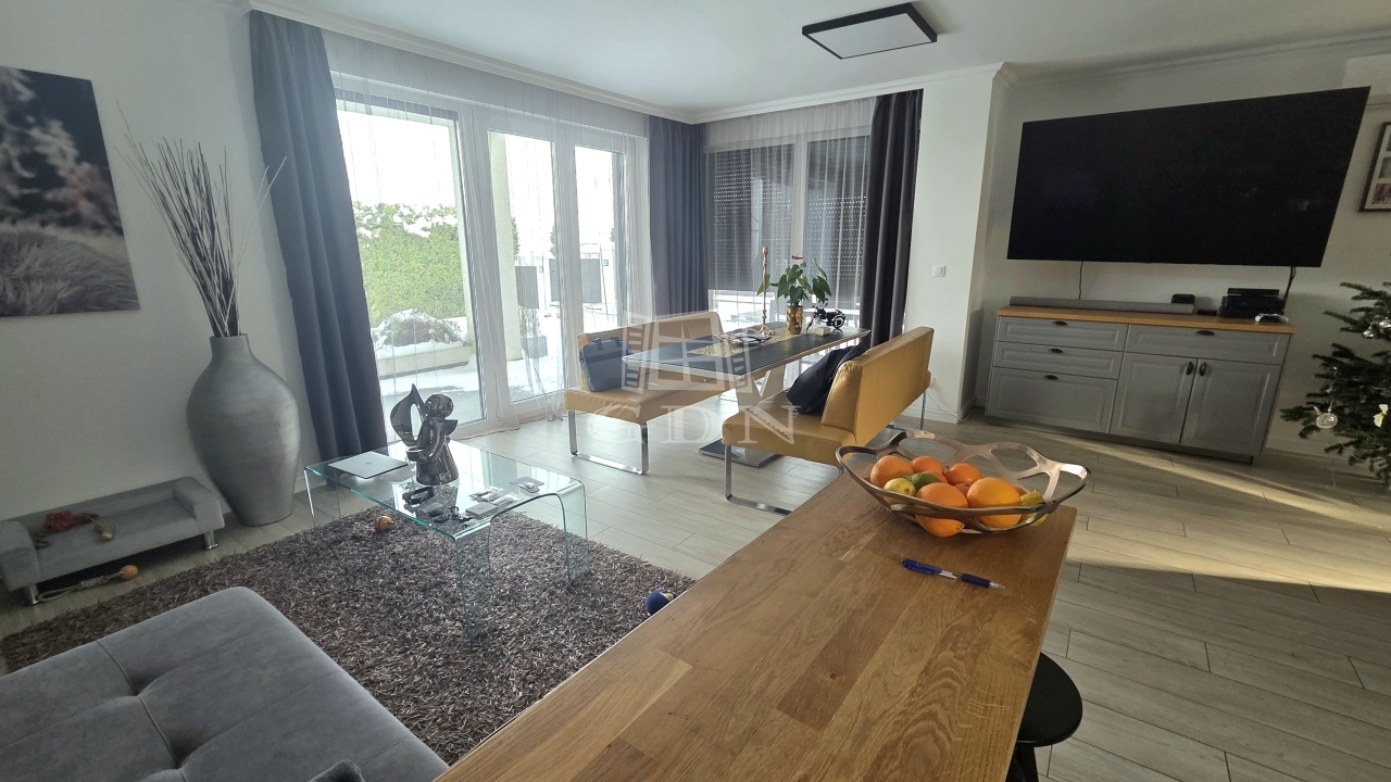 Az 500 m2 területű, kertész által gondozott kert egyik kiemelkedő éke a megközelítőleg 3,5 méter magas babérmeggy élőfal, amely kellő intimitást ad az itt lakók számára.