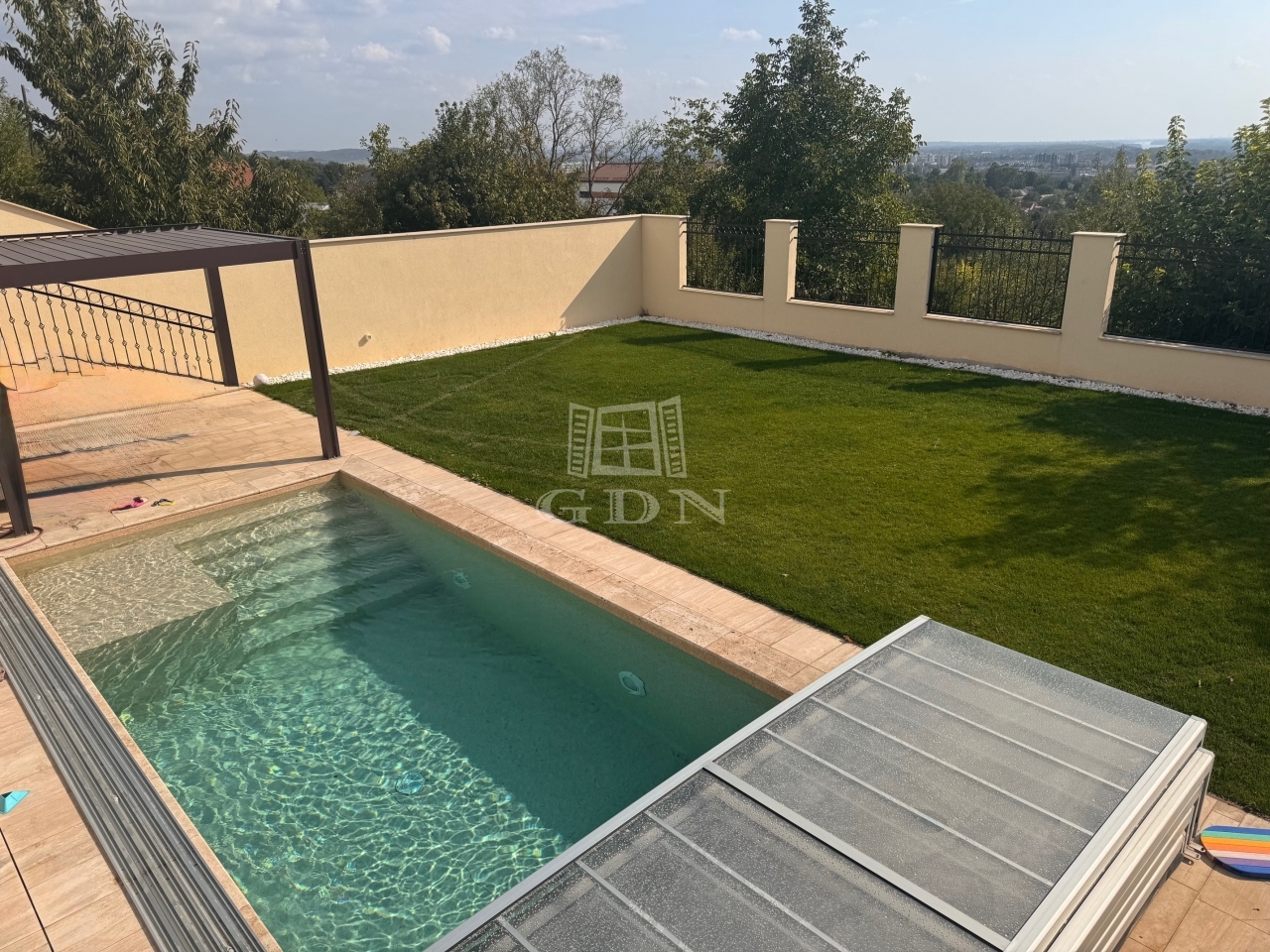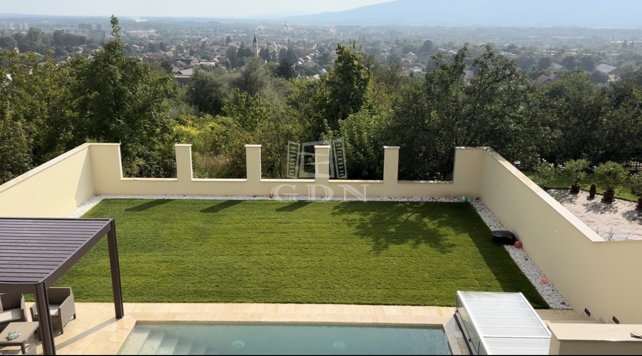 A lankás teleknek köszönhetően utcafronton 1, a kert felé pedig 2 szintes az épület. A pince szinten 2 állásos, tágas garázs, tároló résszel, egy nyárikonyha és egy zuhanyzó kapott helyet. A földszinten 4 szoba, 2 fürdőszoba és hatalmas, tágas nappali egy légtérben, mégis némileg elkülönülten található az étkező és a teljesen felszerelt konyha. A nappaliból nyílik az erkély, ahol kényelmesen elfér egy 6-8 személyes étkezőasztal. A teraszról és a pince szintről is a kertbe jutunk, ahol a csodálatos panoráma mellett egy medence is elénk tárul, amit a kiépített hőszivattyús rendszerrel fűteni is tudunk. A kertben automata (robot) fűnyíró gondoskodik a tulajdonosok kényelméről.