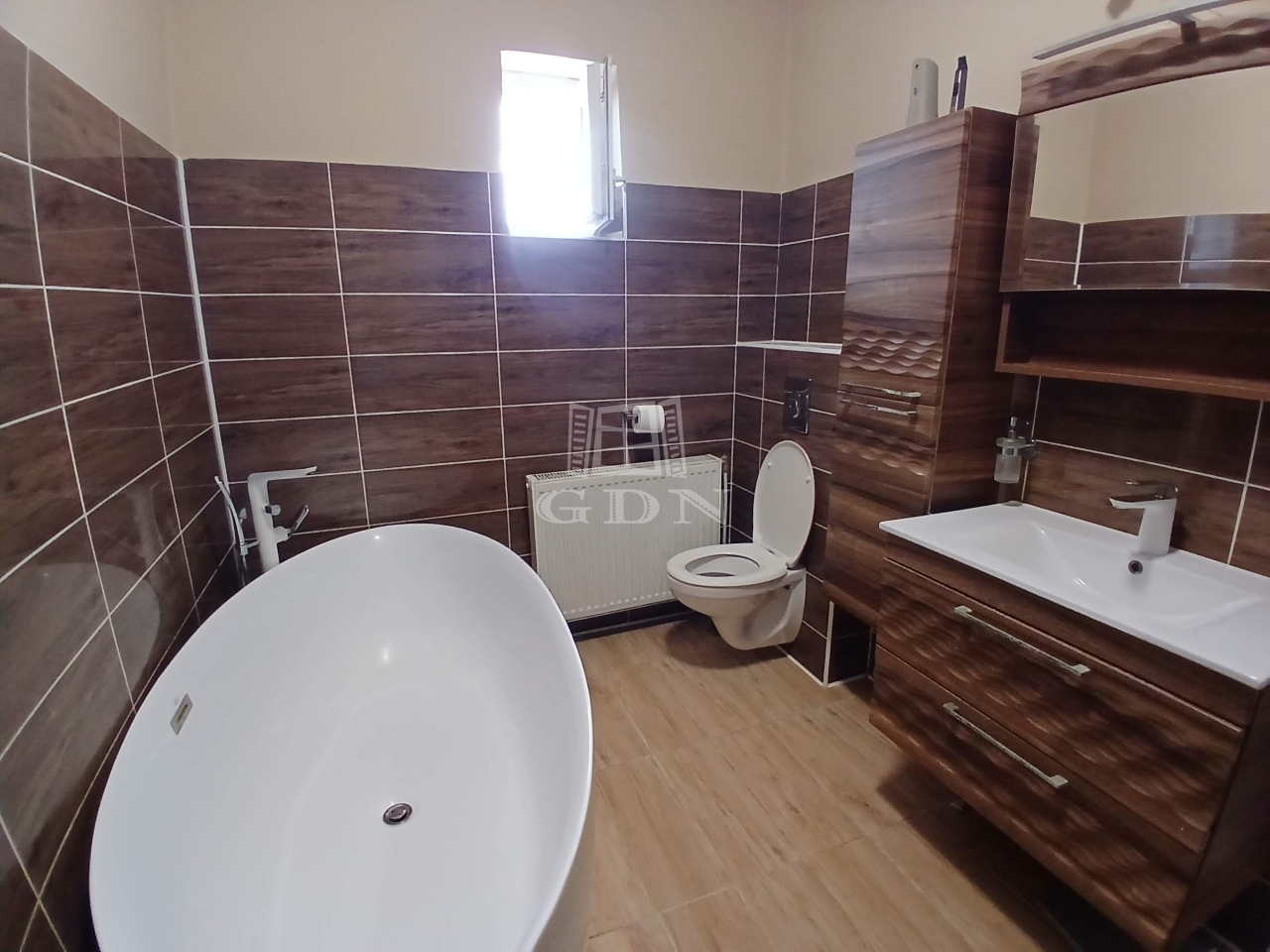 • felújított, modern stílusú fürdőszoba szabadon álló, ovális káddal